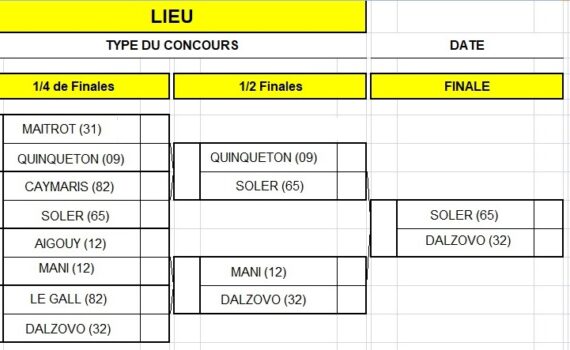 18 équipes inscrites ; 3 poules de 4 et 2 poules de 3Parties en 13 points ou 2 heuresDébut des parties le 9 mai à 14 h :A l’issue des 2 premières parties , 5 matchs de barrage dont celui qui devaitopposer BONIS et MORENO du TEC qui a déclaré forfait.Le 10 […]