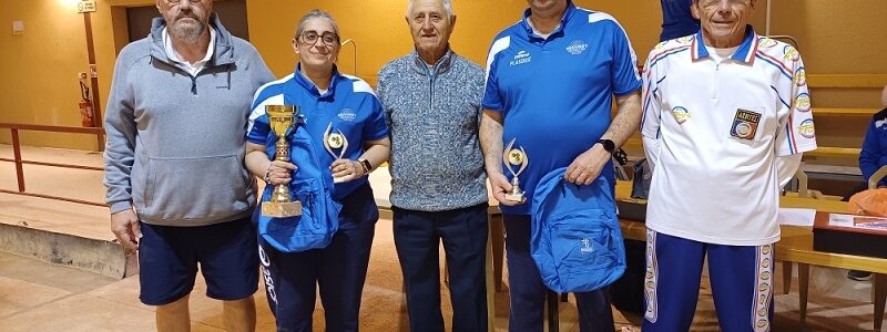 Vainqueurs mixtes ..Baby Baby du cbt avec le doyen de Saint jory Gérard Pasinato et Éric Barrull arbitre