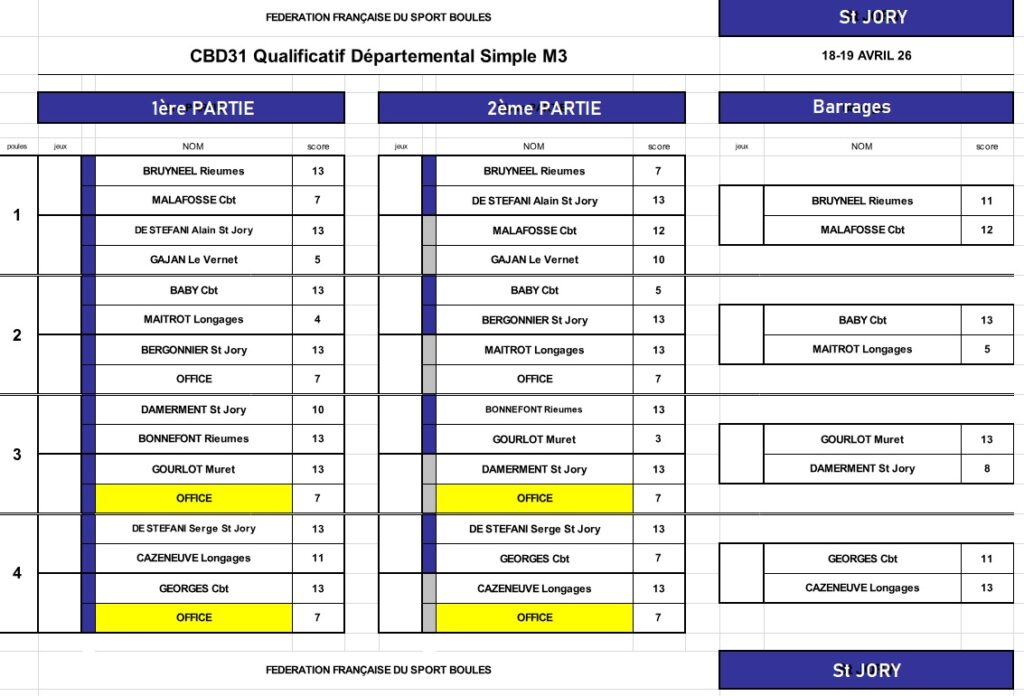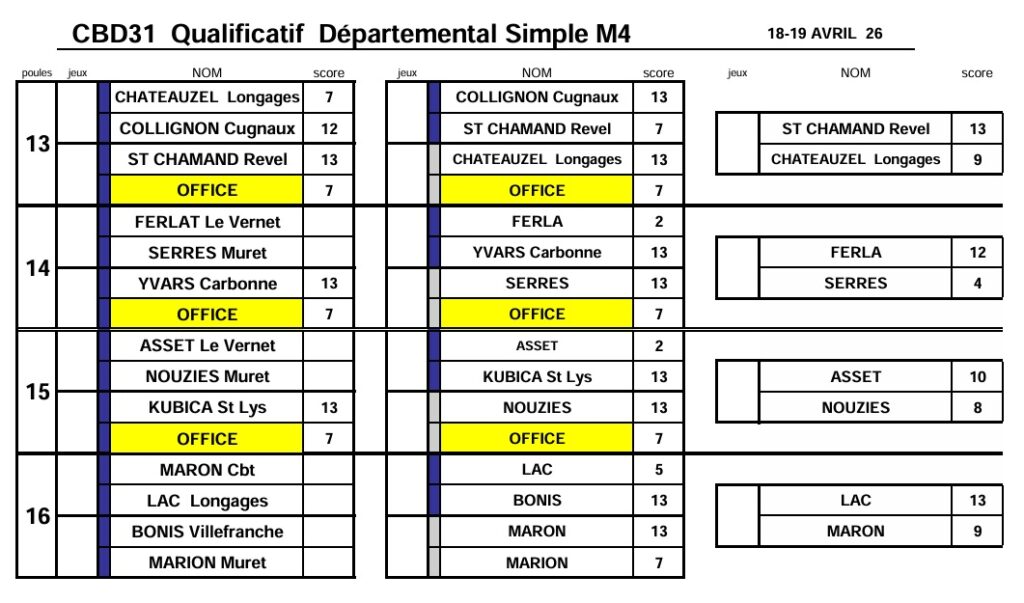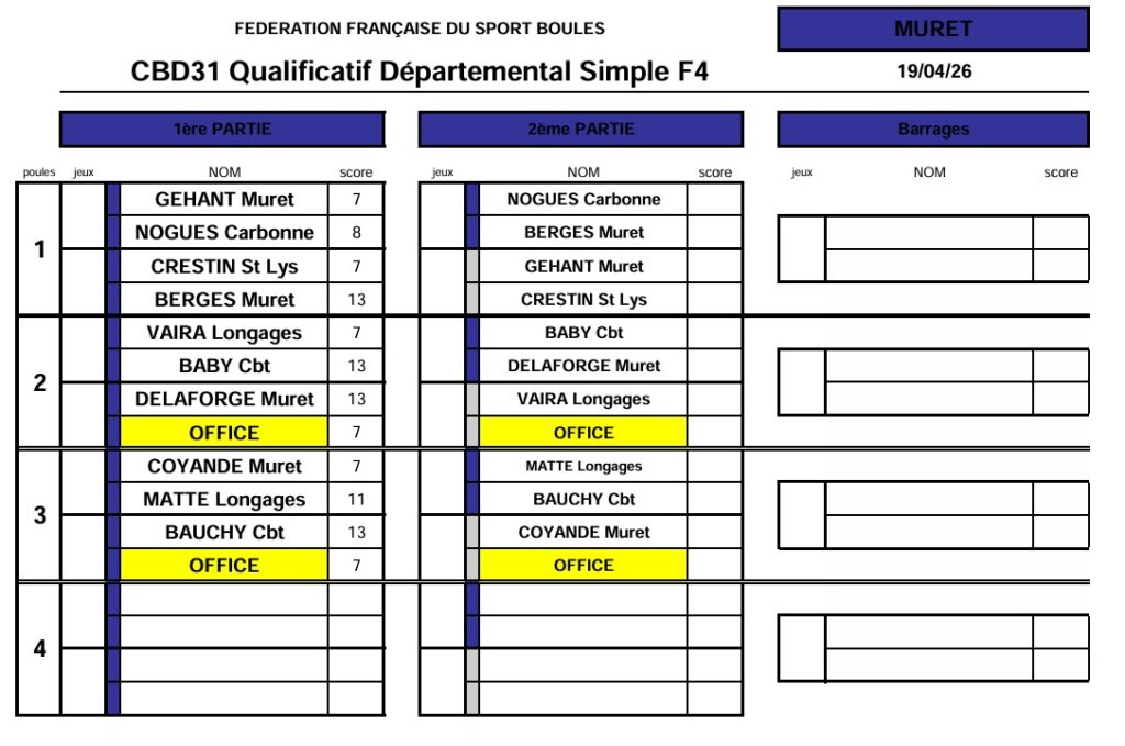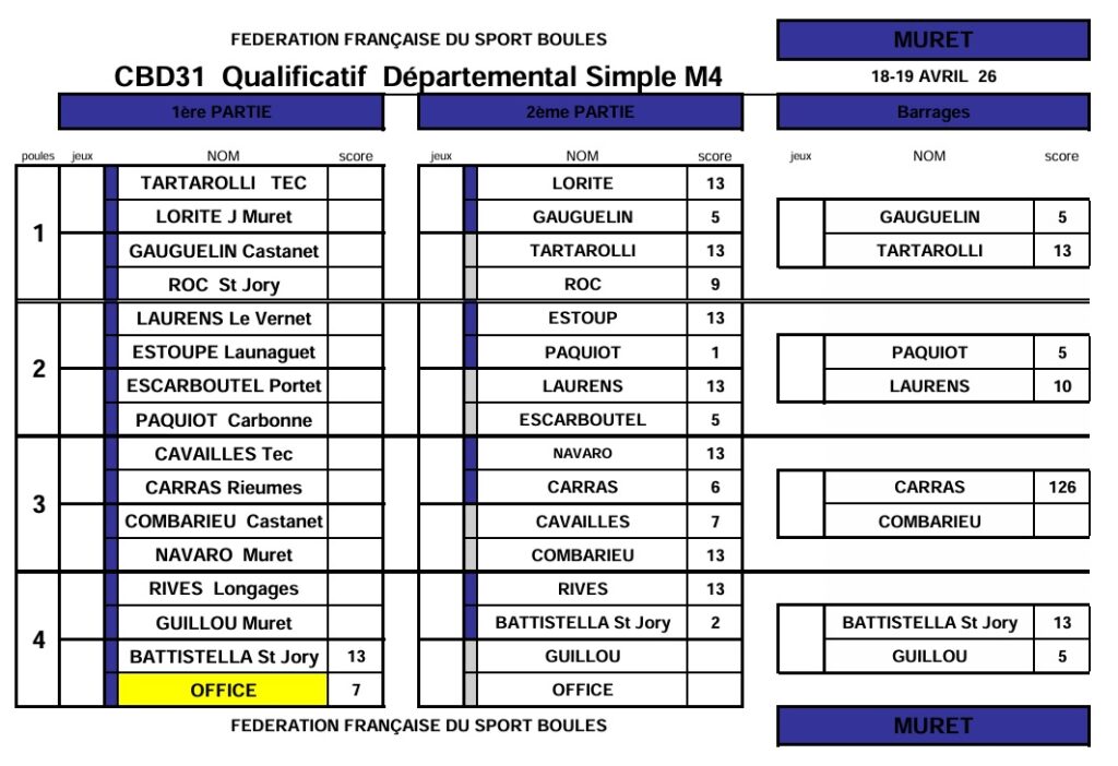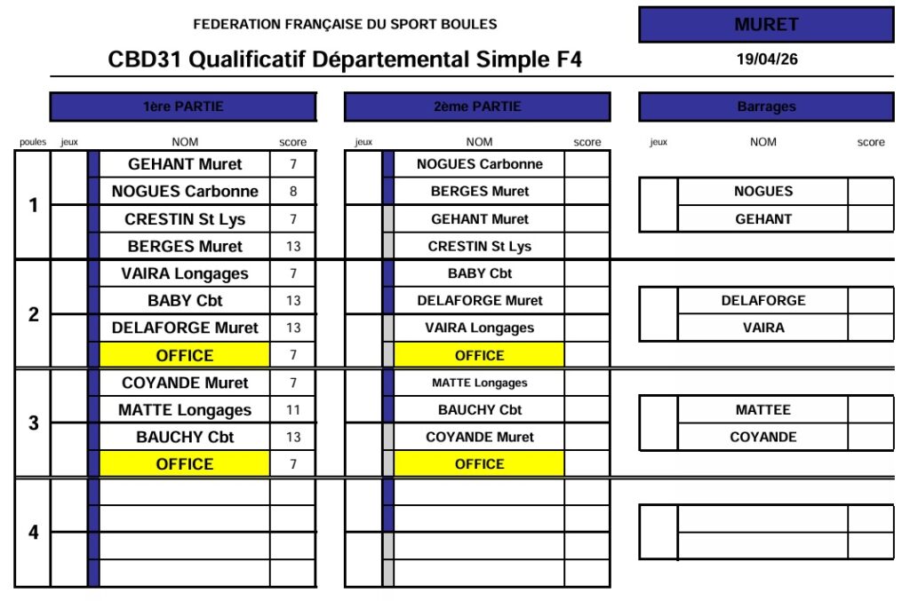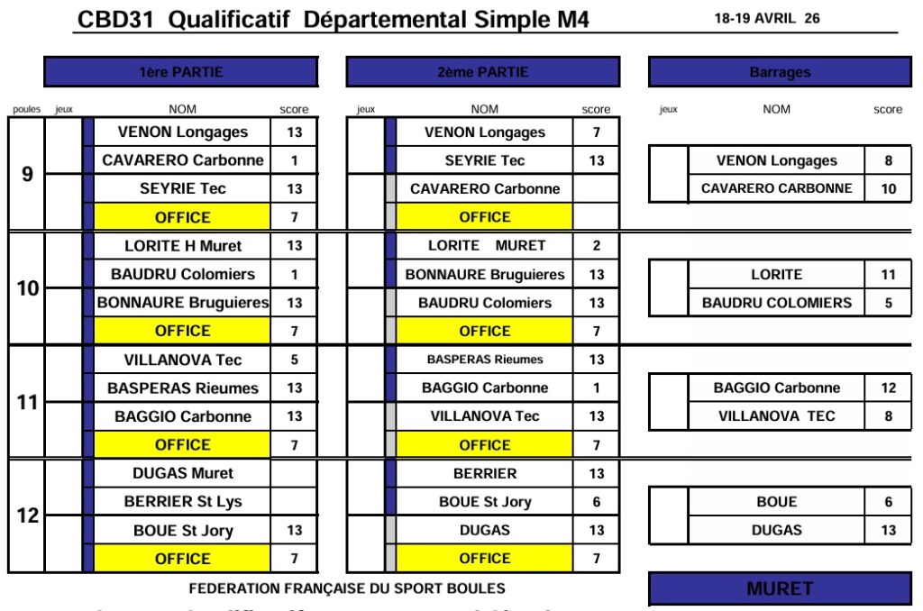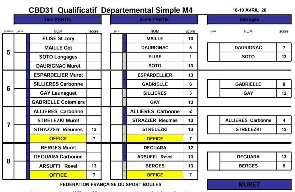 Résultats qualif Simple M4-F4-Sport Boules 18 & 19 avril 2026