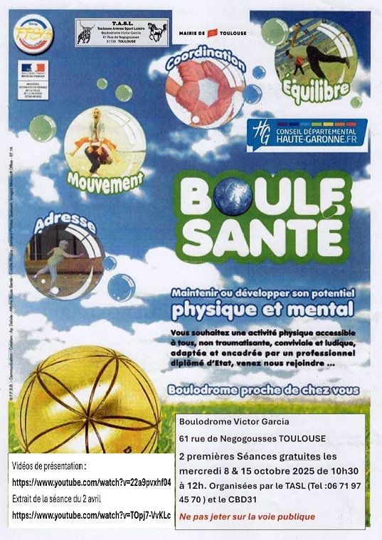 En effet, comme suite d’ une part aux séances de BOULE SANTE organisées à VG en AVRIL et JUIN 2025, et d’autre part aux journées nationales du SPORT de septembre 2025, le CBD 31 et TASL souhaitent valoriser le concept de SPORT SANTE en organisant 2 nouvelles séances gratuites de BOULE SANTE à VG les mercredi 8 et 15 octobre de 10 h30 à 12h ; toutes ces séances sont animées par un professionnel du SPORT, membre du GESBO. »